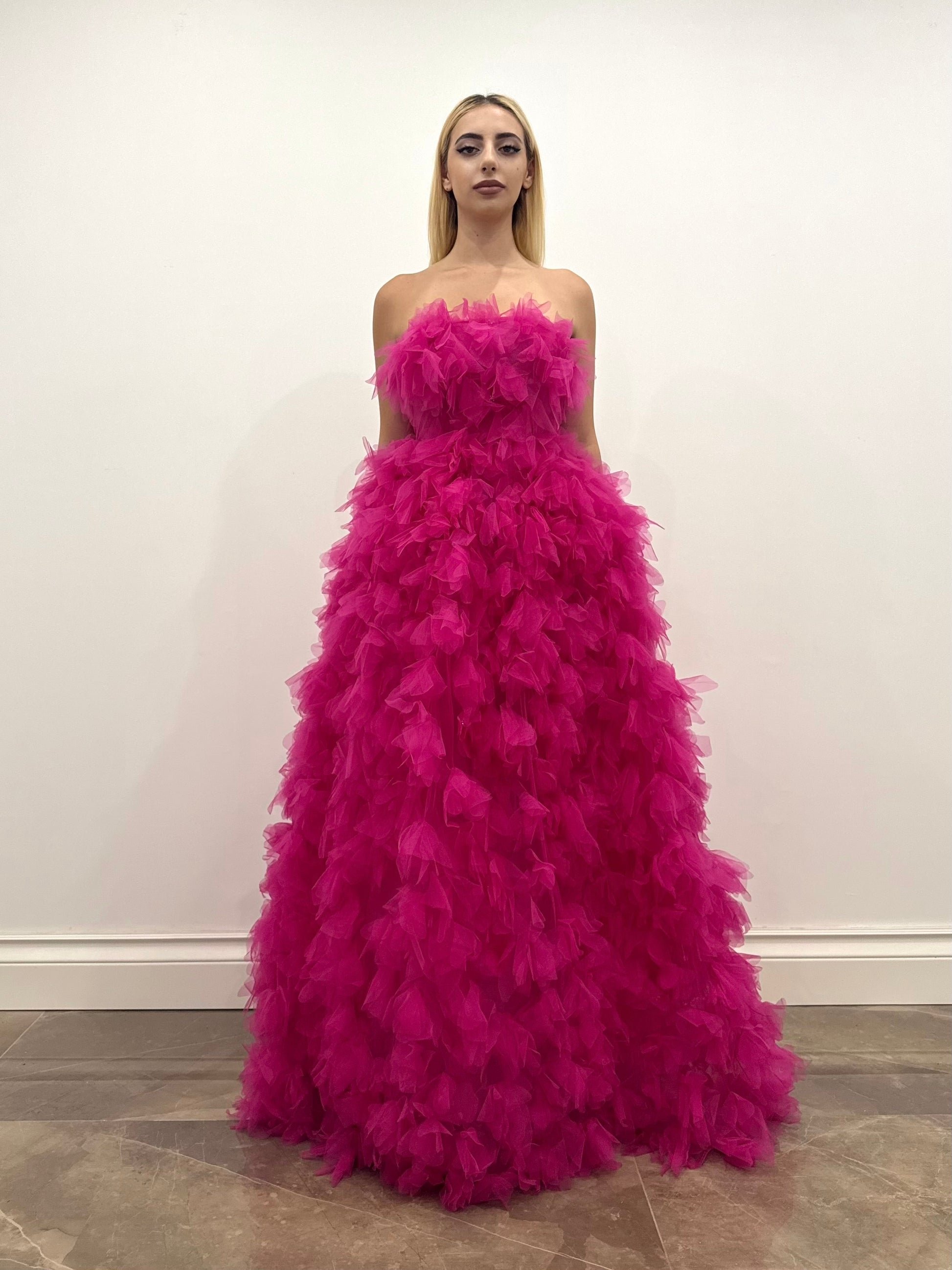 Abito realizzato in tulle, caratterizzato da importante teatralità. Fiori di tulle con cristalli adornano la meravigliosa creazione. La tonalità vibrante rende l’abito moderno e audace.