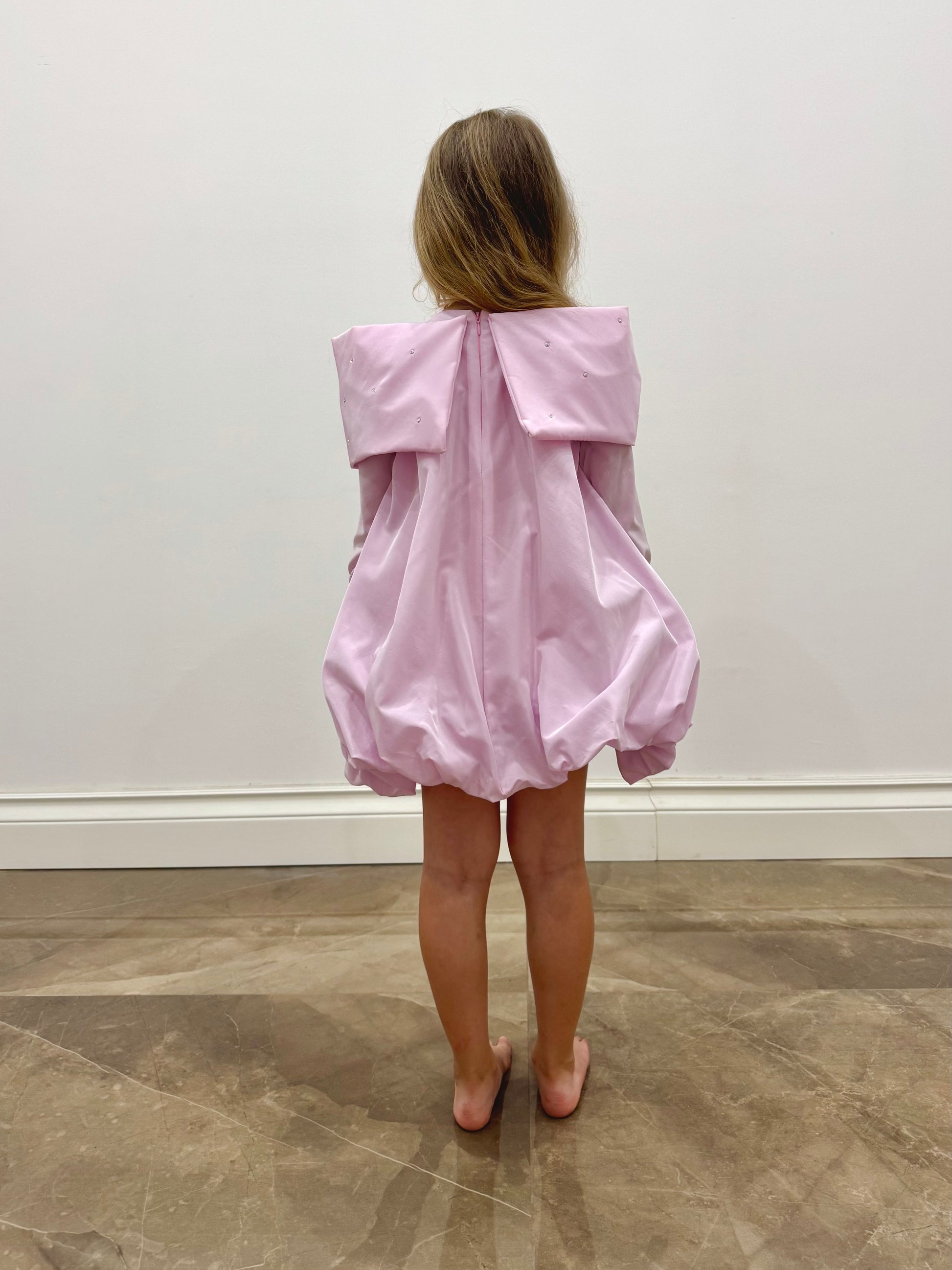 Abito elegante per bambina realizzato in taffetà rosa, impreziosito dal fiocco centrale che diventa protagonista del design. Piccoli dettagli luminosi donano eleganza e delicatezza alla preziosa creazione.