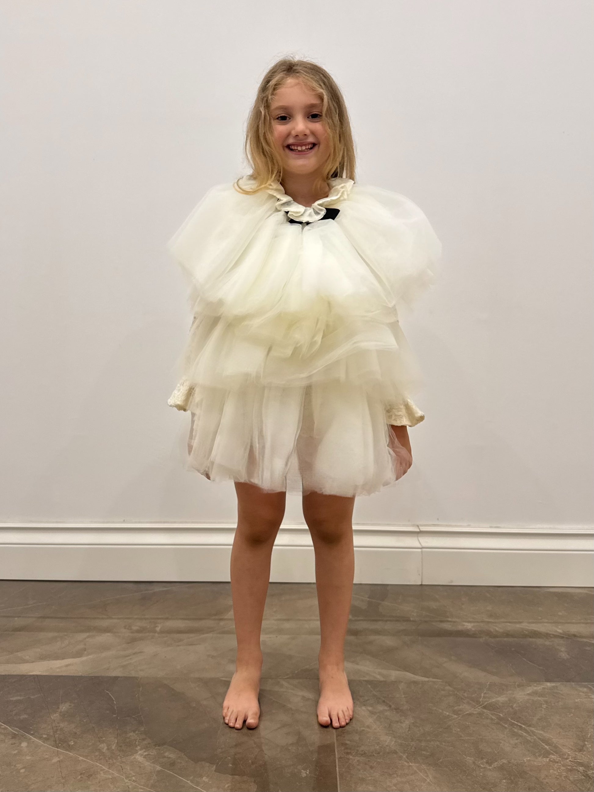 Cappa in tulle voluminoso crea un effetto etereo e romantico. Perfetta da abbinare alla tutina in pizzo bianco.