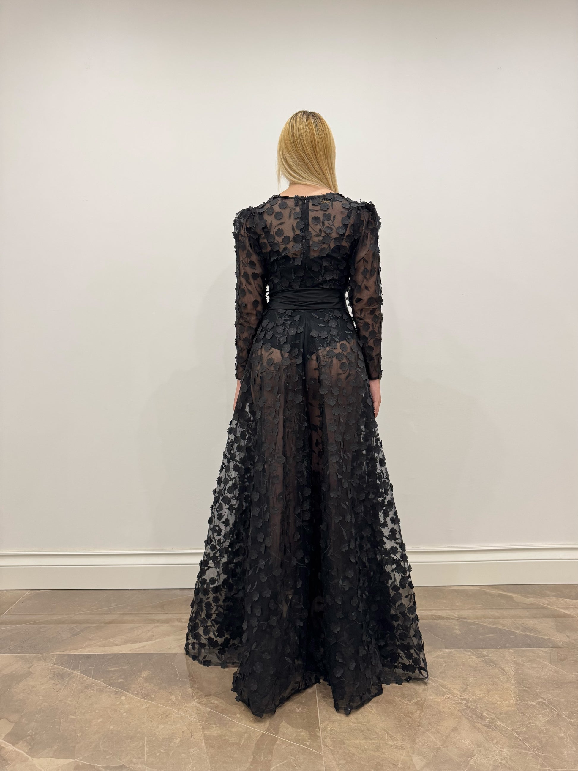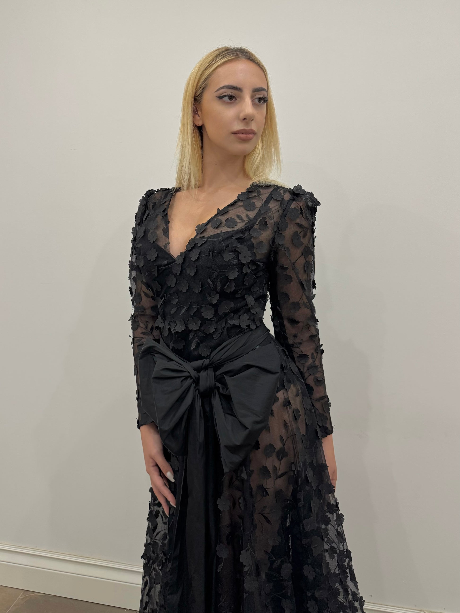 Abito lungo in tulle trasparente ricamato con applicazioni floreali, che conferiscono profondità e texture. Il fiocco in taffetà in vita enfatizza il movimento.
