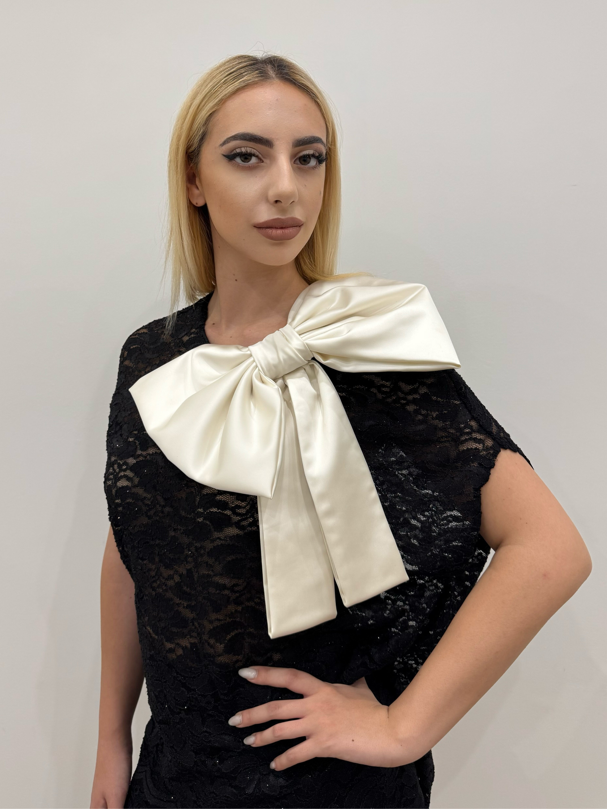 Blusa realizzata in prezioso pizzo brillante, il fiocco sul lato dona movimento ed eleganza alla straordinaria creazione.