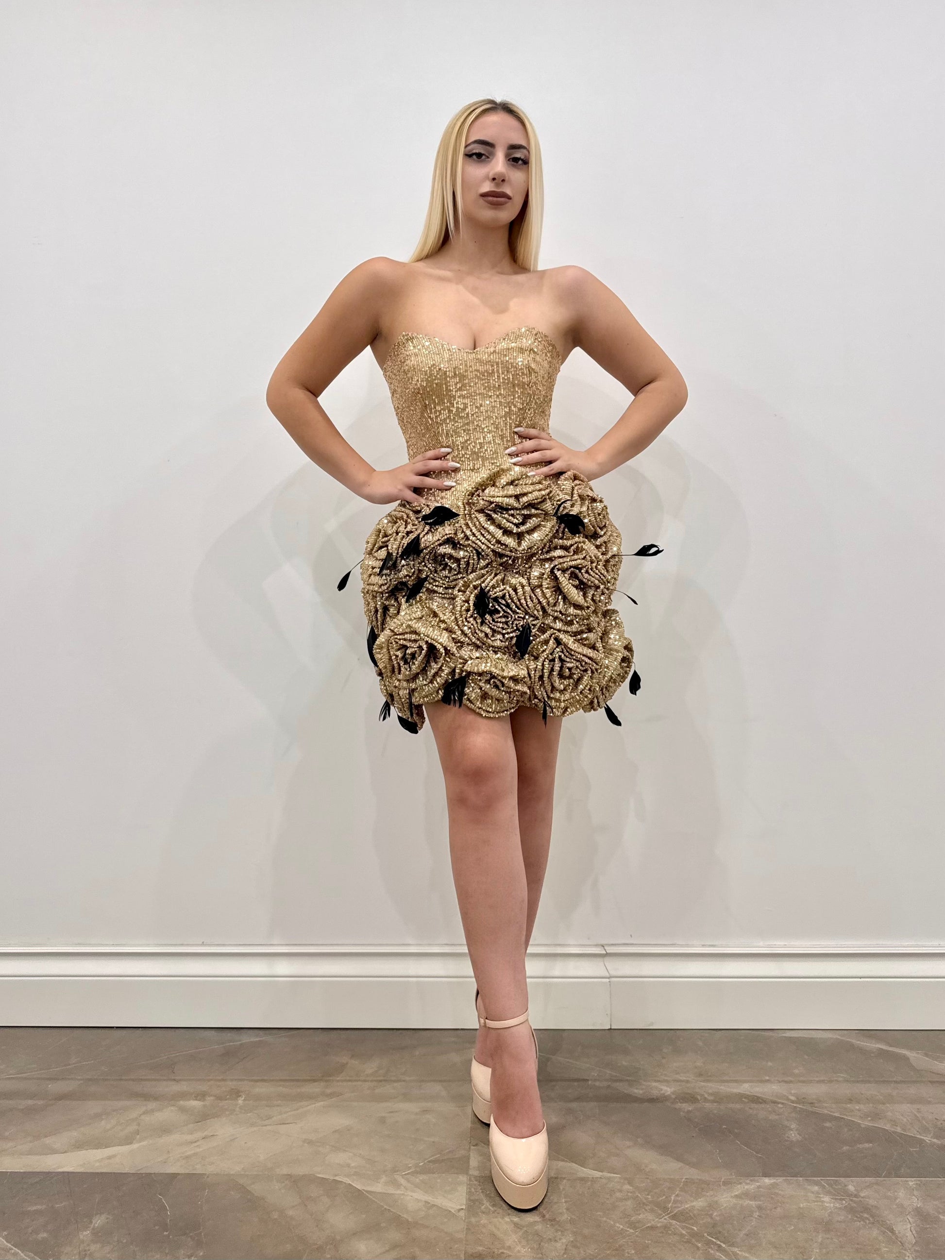 Abito corto in paillettes dorate, che conferiscono straordinaria luminosità. Le rose tridimensionali, decorate con piume leggere, aggiungono un tocco di mistero e movimento.