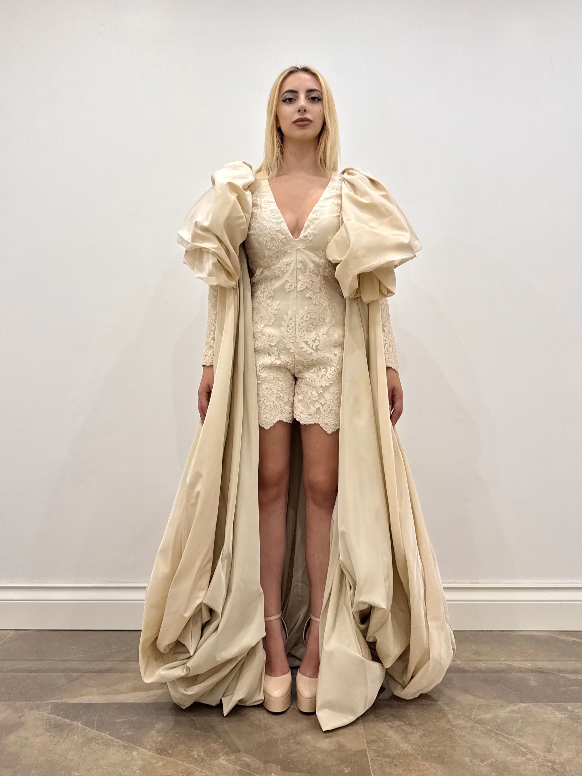 Cappa in taffetà avorio, accompagna l’abito apparendo fluente e regala un effetto sontuoso grazie al volume delle maniche.