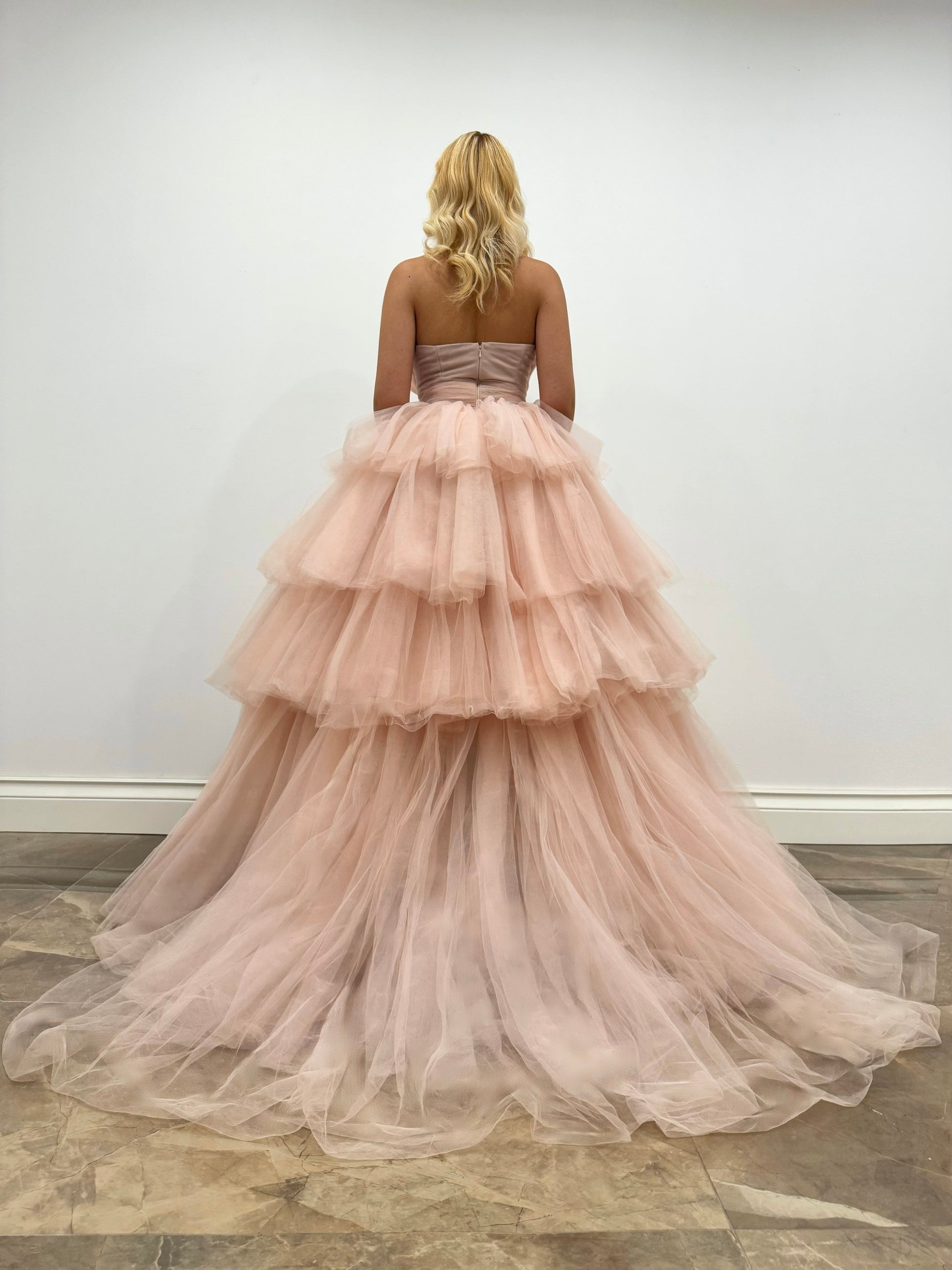 Abito lungo intriso di poesia realizzato in tulle rosa, con un corpetto drappeggiato. La voluminosa gonna a balze è firma dell'eleganza della Maison.