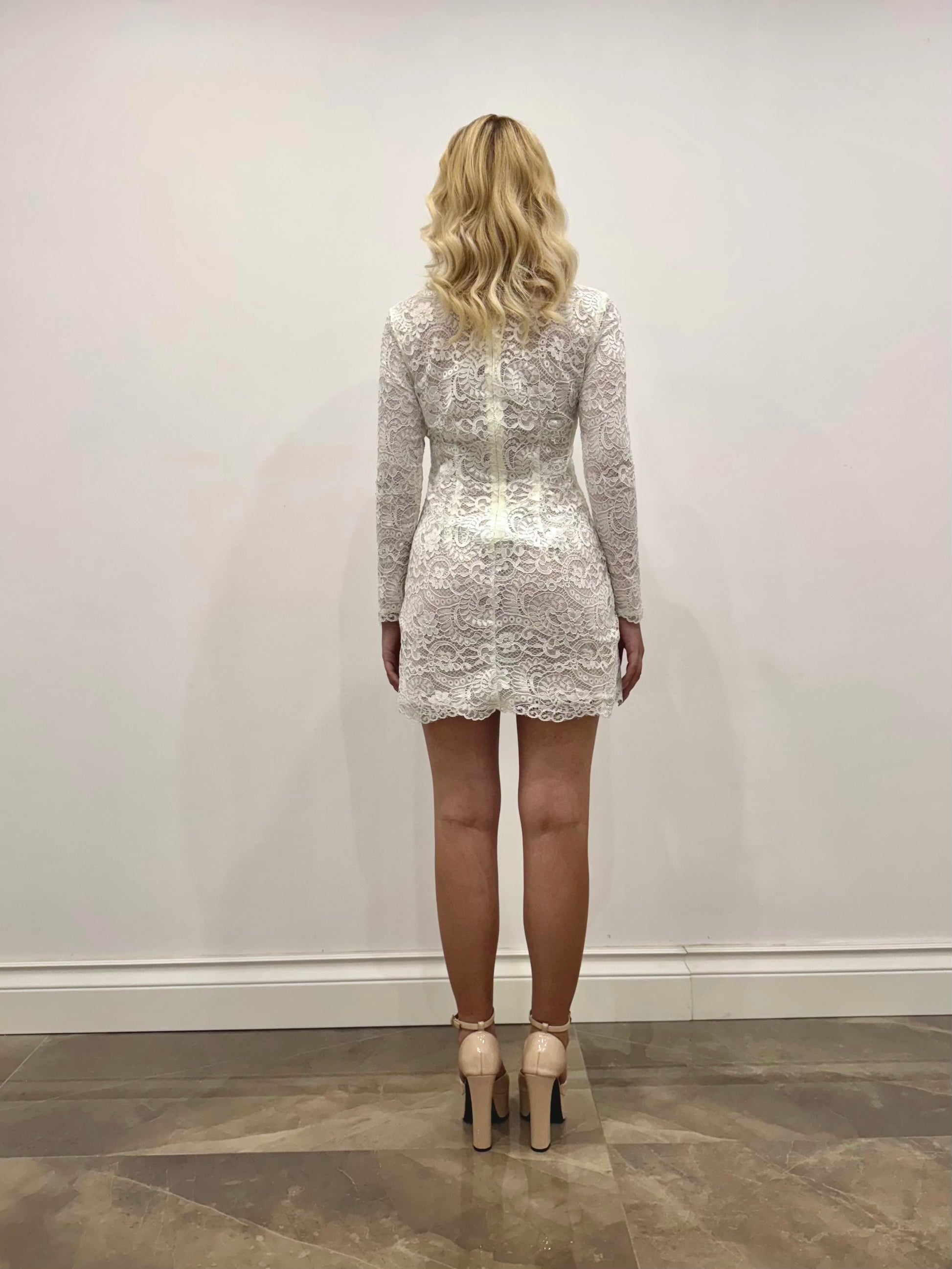 Abito corto in pizzo bianco con prezioso colletto luminoso.
